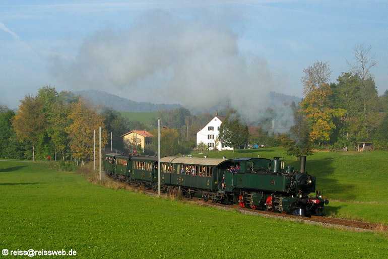 Ed 2x2/2 Nr. 196 (Baujahr 1893) von SBB Historic ist zum Fahrzeugtreffen in Bauma angereist und führt einen Sonderzug auf der DVZO-Stammstrecke, aufgenommen zwischen Neuthal u. Bäretswil (15.10.2005).