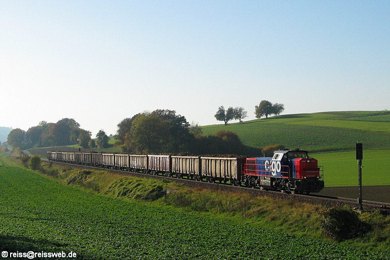 Mit ca. 1000 to Last (14 mit Zuckerrüben beladene Wagen) fährt Am 843 092 an einem herrlichen Herbstsamstag zurück nach Schaffhausen. Aufgenommen wurde sie zwischen Neunkirch u. Beringen (29.10.2005).