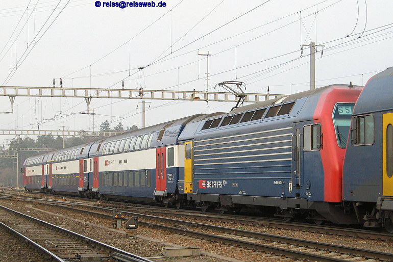 üge) der S-Bahn Zürich sind inzwischen mit roten Einstiegstüren unterwegs, so auch 450 057 auf der S5 Pfäffikon - Rafz, aufgenommen im Bahnhof Hüntwangen-Wil (25.01.2005).
