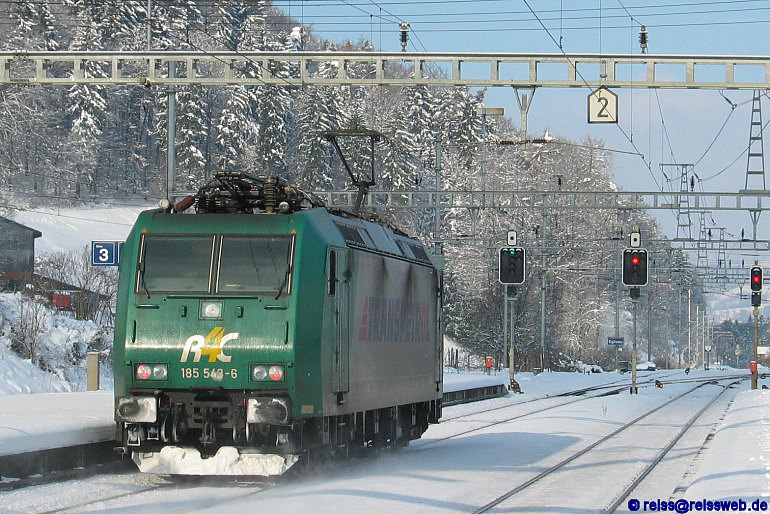 R4C 185 543 hat am Morgen des 07.03.2006 einen Kesselwagenzug nach Niederglatt gebracht und fährt als Lokzug nach Basel zurück. Aufgenommen wurde sie in Eglisau.