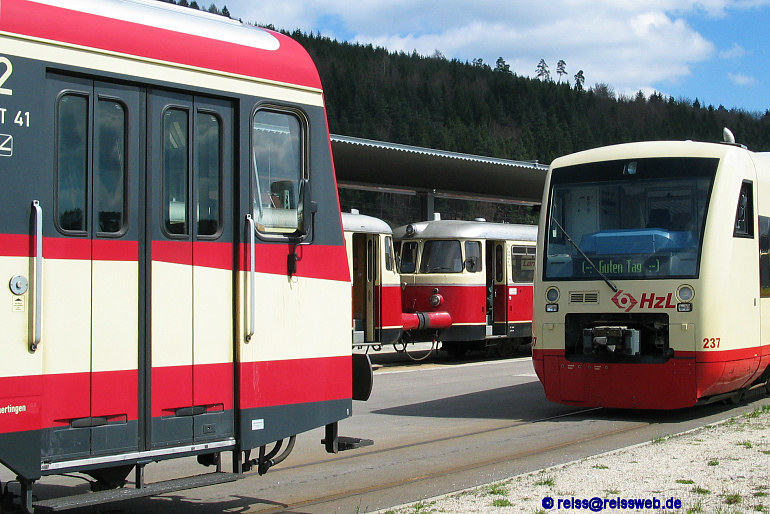 | Tag der offenen Tür am HzL-Standort Immendingen - 3 Fahrzeuggenerationen waren anwesend: Links VT 41 aus der Reihe der NE81-Fahrzeuge, rechts ein Ringzug-RS1 (VT 237), dazwischen steht ein MAN-Schienenbus, der aushilfsweise immer noch zum Einsatz kommt (30.04.2006). |