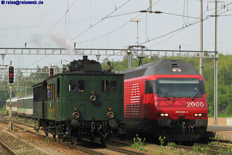 Gut 90 Jahre Eisenbahngeschichte liegen zwischen dem 1902 gebauten CZm 1/2 Nr. 31 der Uerikon-Bauma Bahn und 460 056 als Vertreterin der modernen Fahrzeuge, beide begegneten sich am Abend des 06.05.2006 in Hüntwangen-Wil.