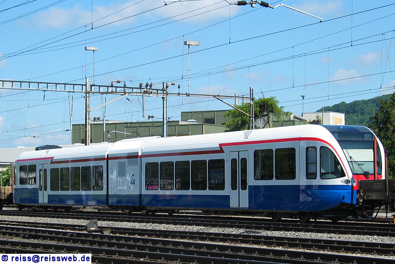 Ein GTW für die italienische Gesellschaft Sistemi Territoriali S.p.A. steht bereit zur Ablieferung in Weinfelden, das Fahrzeug ist bereits zwischen 2 Schutzwagen eingestellt (07.06.2006).