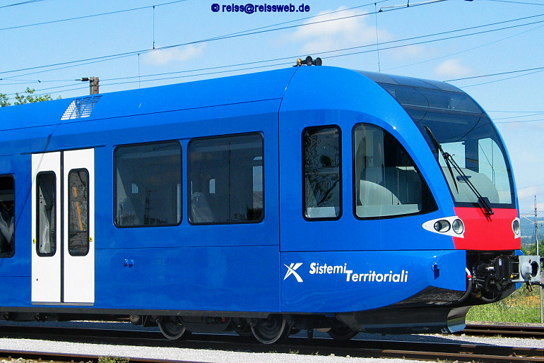 Im ehemaligen MThB-Depot Weinfelden steht ein GTW 2/6 für Sistemi Territoriali S.p.A. in der reinblauen Farbgebung (07.06.2006).