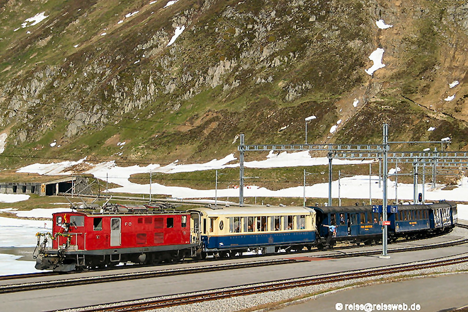 Einfahrt in die Station Oberalppass, im Hintergrund die Galerien entlang des Oberalp-Stausees, die einen Winterbetrieb ermöglichen (10.06.2006).