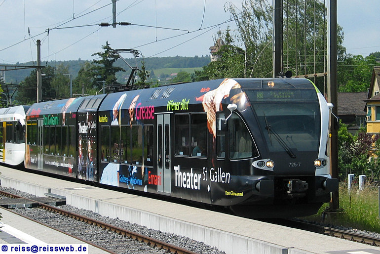 | 526 725 hat Ende Mai 2006 eine Vollwerbung (2 unterschiedliche Seiten) erhalten, Thema ist das Theater St. Gallen bzw. dessen Festspiele (die vom 23.06. - 02.07.06 dauern). Anzunehmen ist, daß diese Lackierung nur für einen begrenzten Zeitraum am Fahrzeug bleiben wird. |