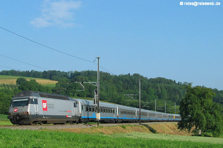 460 100 "Schweizer Fernsehen" ist mit einer Re 4/4 II-Planleistung zwischen Schaffhausen u. Zürich unterwegs, die grau-silbernen CIS-Wagen harmonieren perfekt mit der Farbe der Lok (27.06.2006).