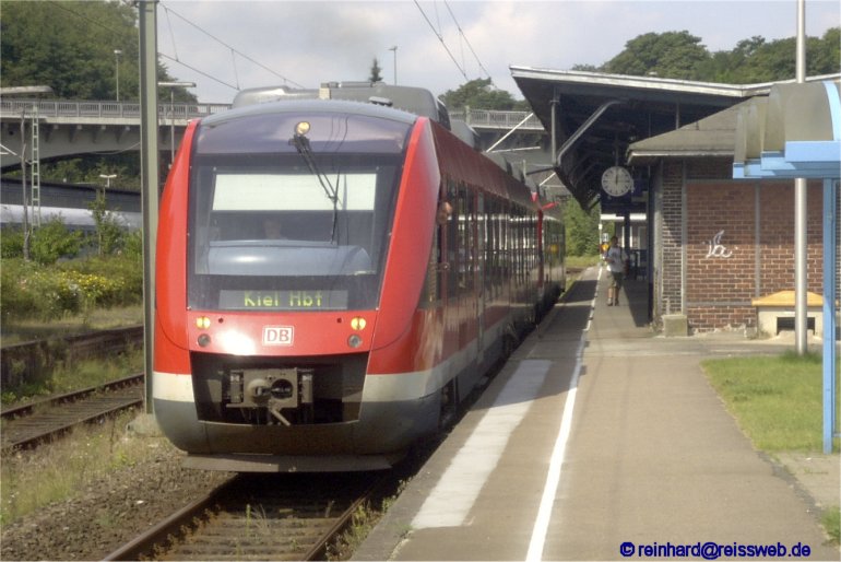 Der einzige zum Fotografieren geeignete Bahnsteig in Flensburg Hbf (im Bild links mit Gras bewachsen) war leider nicht mehr zugänglich, sodass das Bild von der Schattenseite entstand. (16.08.2002)