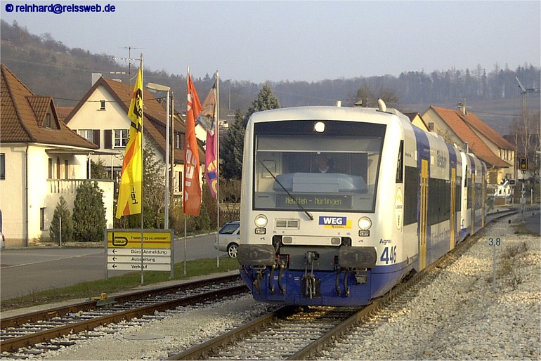 VT 446/447 der WEG im neuen Connex-Design (die WEG gehört zur Connex-Gruppe) bei der Einfahrt in Frickenhausen (Strecke Nürtingen - Neuffen, Dez. 2002)