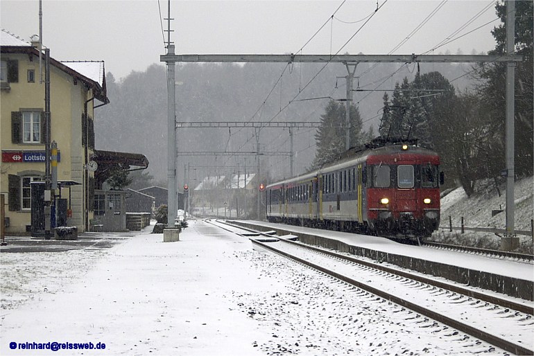 Regionalzug Bülach - Schaffhausen bei leichtem Schneetreiben (zum ersten Mal in diesem Winter) im Bahnhof Lottstetten (05.01.2003).