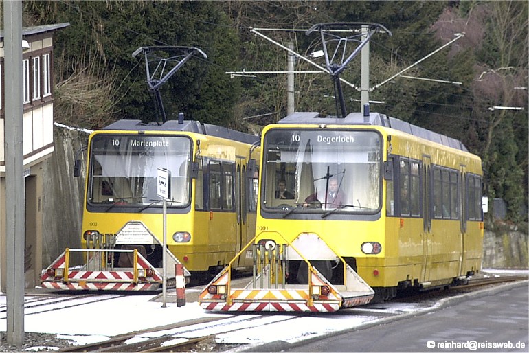 Blick talwärts auf die Ausweichstelle "Wielandshöhe". Die Vorstellwagen dienen dem Transport von Fahrrädern.