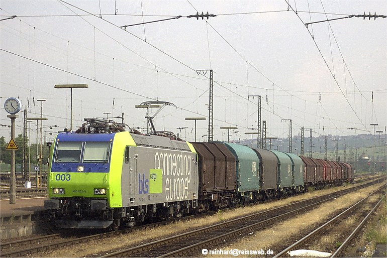 Ebenfalls mit einem "gewöhnlichen" Güterzug erreichte 485 003 von Mannheim kommend Weil und fuhr von dort in den Bh Haltingen (17.06.2003).