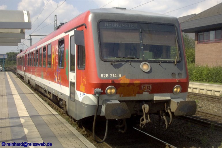 628 214 ist mit Motiven aus dem Kinderbuch “Jim Knopf und Lukas der Lokomotivführer” beklebt. In diesem Buch spielt eine Lokomotive namens “Emma” eine der Hauptrollen (Schleswig - 16.08.2002)