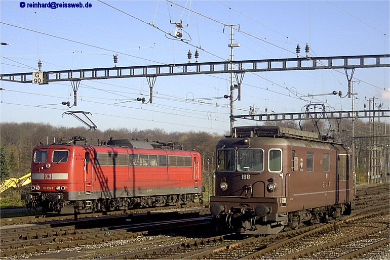 DB AG 151 156 wartet darauf, ihren Zug nach Norden übernehmen zu können. Währenddessen setzt BLS 188 in die Ausfahrgruppe Richtung Süden um (Muttenz - 12.11.2002).