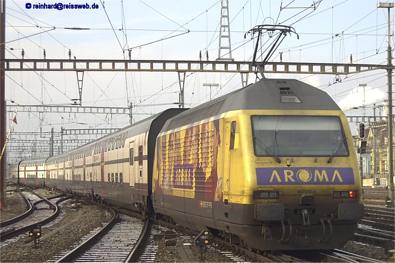 bei der Ausfahrt aus Zürich HB (08.01.2003). Diese Lok trug früher (zusammen mit 460 037) die Werbung "LA POSTE".