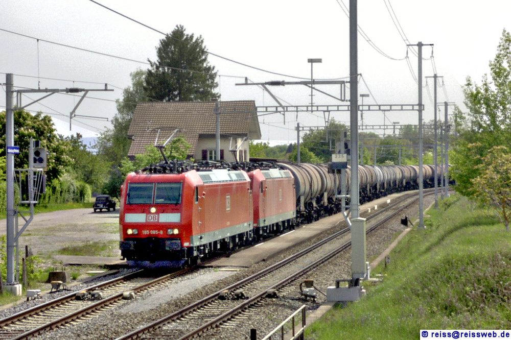 185 085 u. 087 beim Kreuzungshalt in der Station Altenburg-Rheinau (05.05.2003).