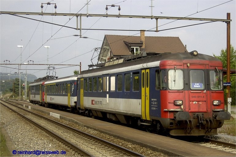 | Nur wenn Steuerwagen Mangelware sind, wird ausnahmsweise eine Kombination zweier RBe4/4 mit einem EWII-Mittelwagen gefahren, hier in Altenburg-Rheinau am 21.09.2002 (Bild der Woche war ein anderes Bild dieser Garnitur, die ein ganzes Wochenende so gefahren wurde). |