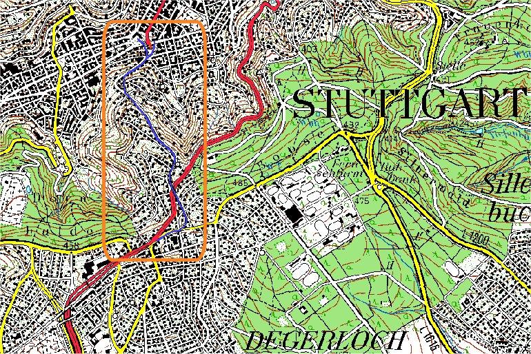Übersichtsplan der Strassenbahnlinie Marienplatz - Degerloch ( in blau eingezeichnet). Der Abzweig zum Depot ist ebenfalls eingetragen (oben rechts). Die Strecke führt vom 260 m ü.M. hinauf zum 465 m hoch gelegenen Stadtteil Degerloch.