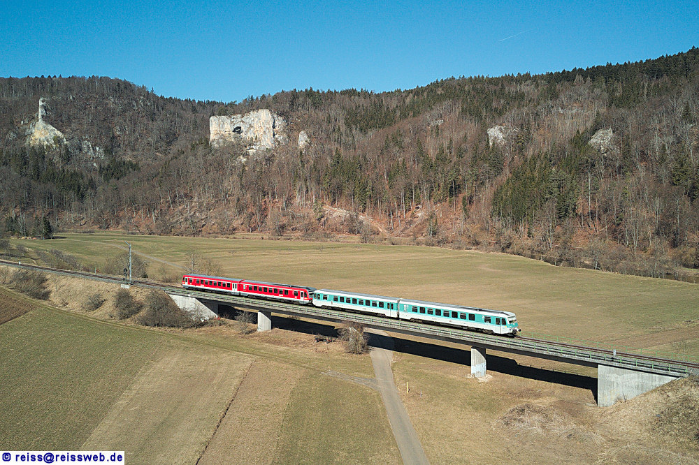 Der mintgrüne 628 436 / 526 und der rote 629 004 / 628 904 überqueren am 28. Februar 2021 auf dem Weg von Donaueschingen nach Ulm eine Brücke in der Donauniederung bei Fridingen