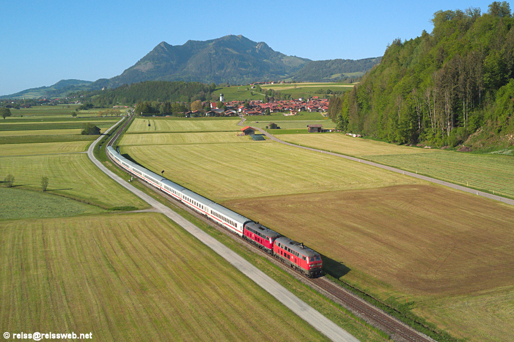 218 401 und die altrote 218 155 haben den IC 2013 aus Dortmund in Stuttgart übernommen und bringen ihn nach Oberstdorf (Altstädten, 31.05.2021).