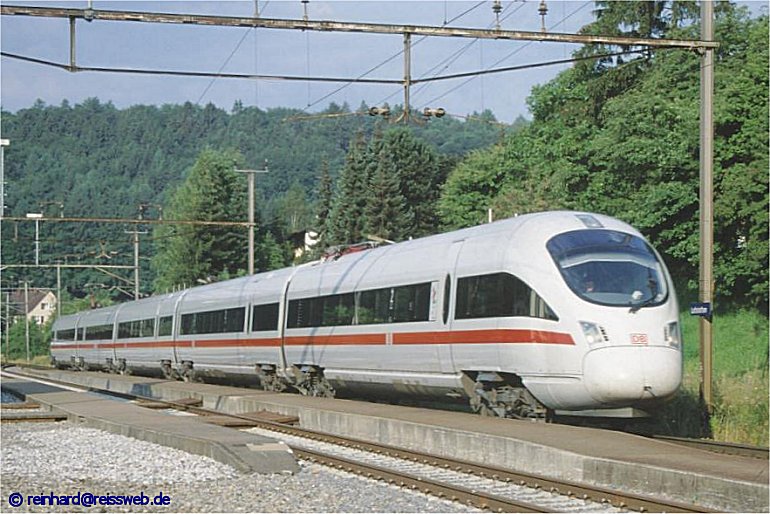 ICE Zürich - Stuttgart passiert wenige Minuten später den Bhf. Lottstetten, gerade wurde das Rampengleis ausgebaut, die abgerundete Bahnsteigform ist noch gut zu erkennen (Juli 99)