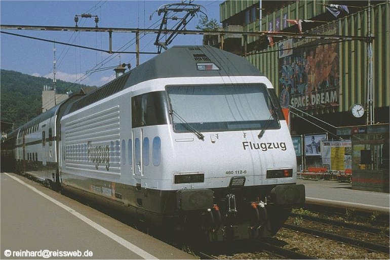 Als die Zugverbindung ZH-Flughafen - Basel SBB aufgewertet wurde (neues Wagenmaterial, kürzere Fahrzeit unter Umgehung von Zürich HB), wurde der Begriff “Flugzug” und die passende Lok geschaffen (Baden, Sommer 1999)