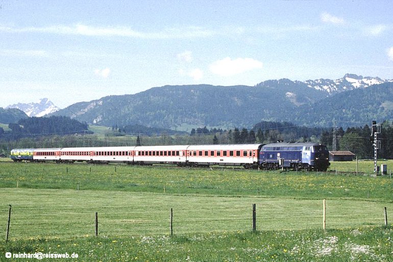 218 473 erhielt eine Lackierung in "König Ludwig-blau" und zieht hier einen IC Richtung Immenstadt. Als weitere Besonderheit läuft am Schluss ein Packwagen aus einem der beiden Touristikzüge mit (Altstädten, 09.05.2000).
