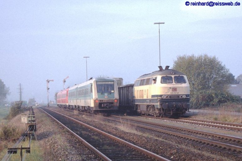 225 091 wartet im Ladegleis, während eine 611-Doppelgarnitur den Bahnhof passiert (Wilchingen-Hallau, Herbst 2001).