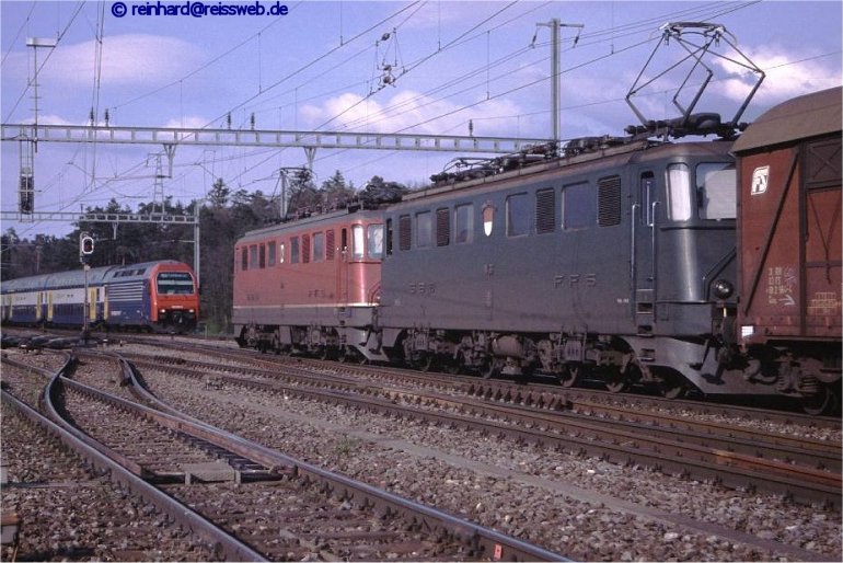 Eine S5, von Rafz kommend, kreuzt einen Güterzug mit (planmässiger) Doppelbespannung in Form von 2 Ae 6/6 (Hüntwangen-Wil, 19.04.2002)