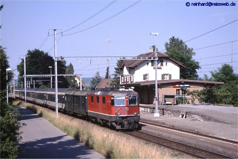 In der Spätnachmittagssonne passiert eine Re 4 /4 II den Bahnhof Lottstetten, die ehemalige Laderampe ist gut zu erkennen (Juni 2002)