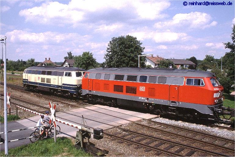 217 014 und 016 passieren den Bahnübergang beim Wärterstellwerk.....