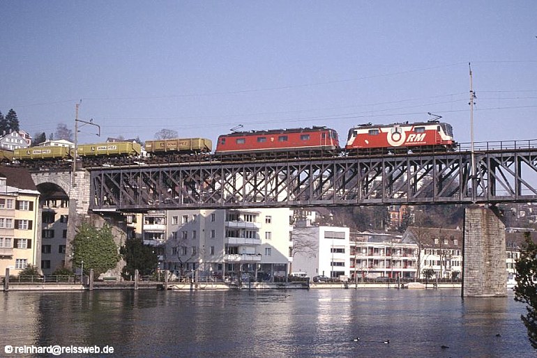 Der Aushubzug Sissach - Schlatt auf der Rheinbrücke bei Feuerthalen, wenige km vor seinem Ziel (19.02.2003).