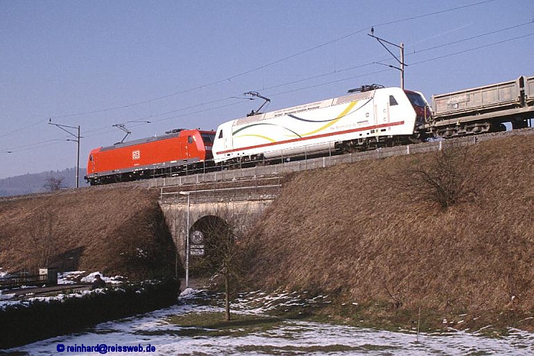 Der Messzug mit 185 083 u. 128 001 kurz vor Sissach (20.02.2003).