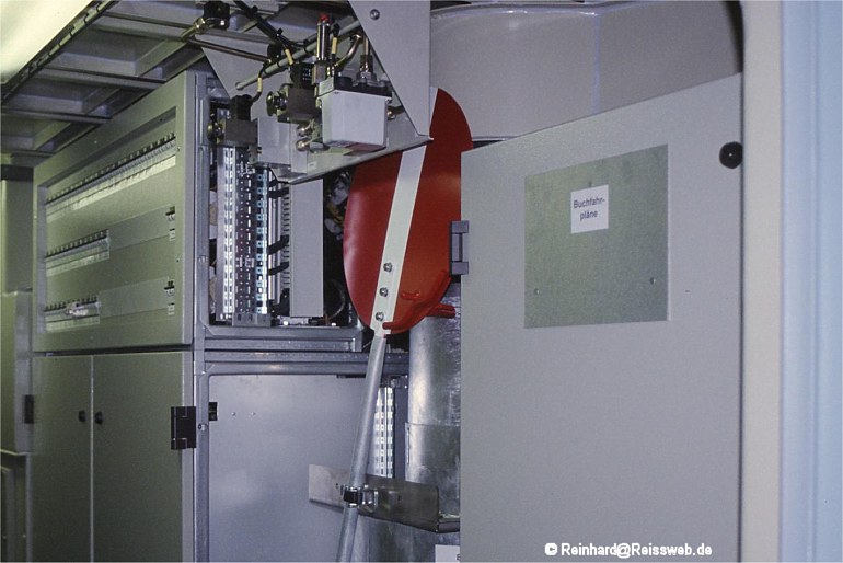 Blick in den Maschinenraum der 185 092, auch hier ist die CH-Ausrüstung deutlich zu erkennen in Form eines Schutzsignals (Horn, 01.04.2003).