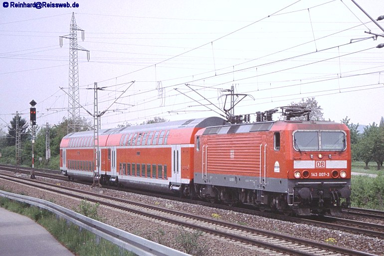 143 007 erreicht am 06.05.2003 mit einem 2-Wagen-Doppelstockzug Haltingen. Dieser Zug dient wohl zur Überführung von Wagen nach Basel Bad Bahnhof.