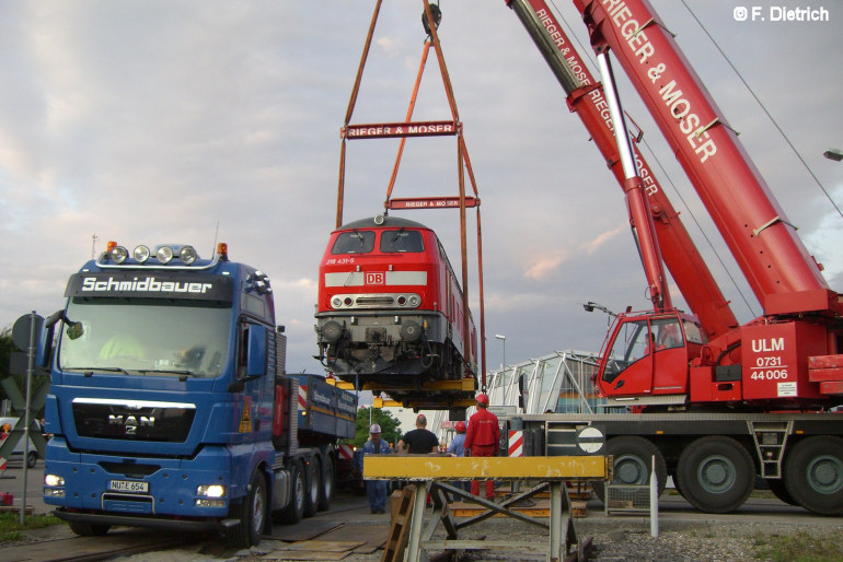 | Für eine interne Veranstaltung der MTU in Friedrichshafen wurde die 218 431 am 10.07.2009 auf einen Strassentieflader umgesetzt. Sie verbrachte das Wochenende im MTU-Werk II in der Domänenstrasse. Das Foto wurde mir von Frank Dietrich zur Verfügung gestellt. |