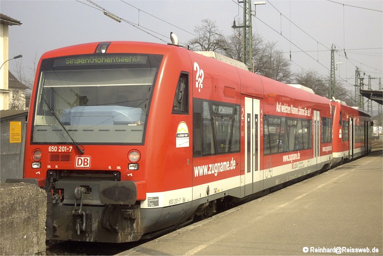 | 650 201 macht Werbung in eigener Sache - die Regionalbahn zwischen Friedrichshafen und Singen, die mit der BR 650 gefahren wird, sucht noch einen Namen (Singen, 31.03.2003). Wenige Stunden nach dieser Aufnahme wurde er durch einen Brand schwer beschädigt. |