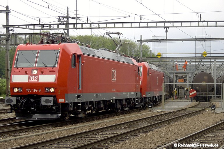 185 114 u. 085 rangieren ihren Zug direkt in den Anschluss "Tanklager Rümlang". Die hintere Lok ist abgebügelt, da ziemlich genau bis an die Fahrdrahtgrenze gefahren werden muss und sich der vordere CH-Bügel nicht heben liess (30.04.2003).