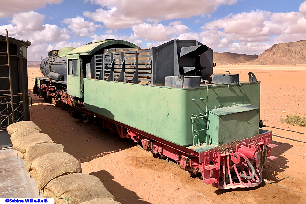| Pacific No. 85 der Hedjaz Jordan Railway, gebaut 1953 von Nippon Sharyo in Japan und ursprünglich für Siam (das heutige Thailand) bestimmt. Einst im Einsatz für Touristenzüge Wadi Rum - Akaba, ist sie schon einige Jahre nicht mehr angeheizt worden. Aufnahme von meiner Schwester Sabine (Wadi Rum, 08.11.2022). |