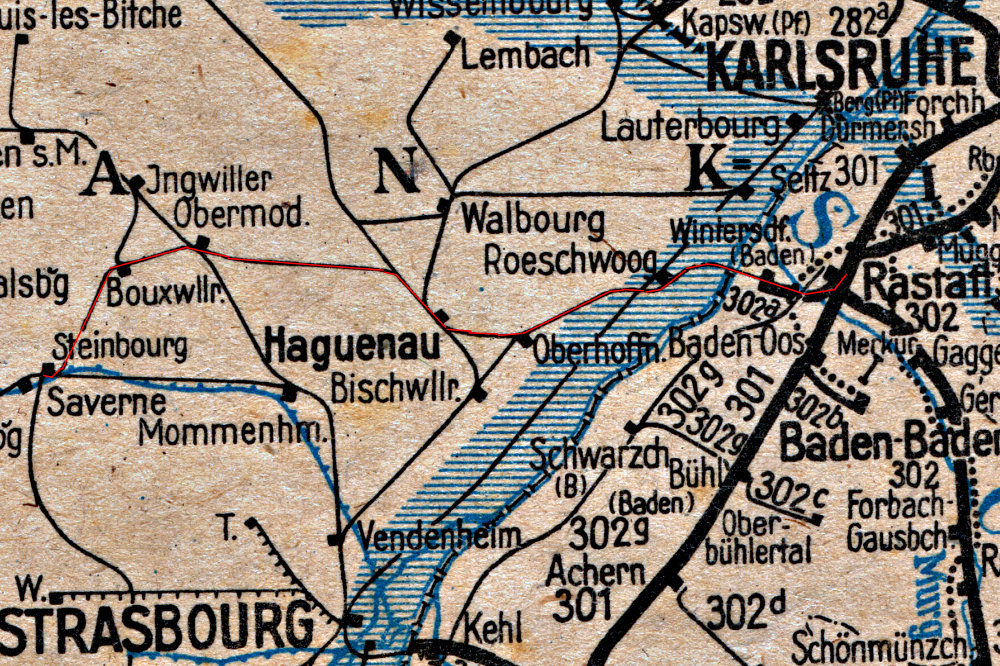 | Scan eines Kartenausschnitts der ehemaligen strategischen Strecke Rastatt - Wintersdorf - Rœschwoog - Zabern (Saverne). Wurde von der Reichsbahn-Direktion Karlsruhe 1946 herausgegeben. Das Original der Karte (Reichsbahn-Kursbuch Französische Zone / Zone Française) stammt aus meiner Kartensammlung. |