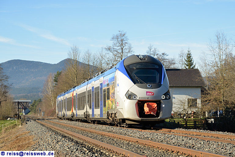 Régiolis 83555M fährt als TER 31819 von St. Dié nach Strasbourg, aufgenommen bei Urmatt (05.01.2015).