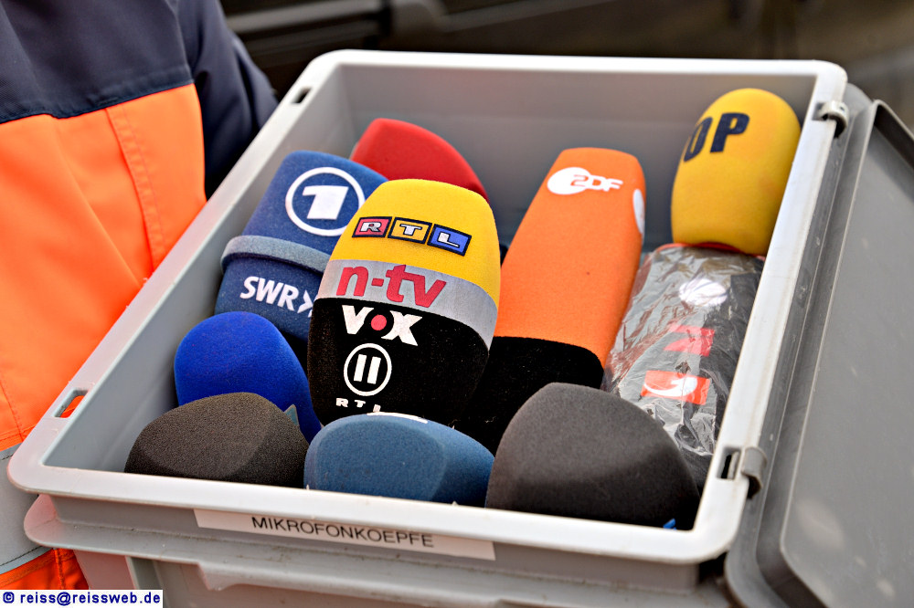 Einer der anwesenden Reporter zeigte mir seine Kiste mit den verschiedenen Mikrofonkappen, die er passend zu seinen Auftraggebern einsetzt. Man erkennt: Wo "SRF" draufsteht, ist nicht immer "SRF" drin.... (Rafz, 21.02.2015).
