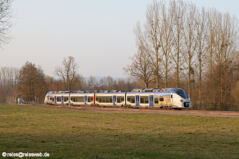 Régiolis 83555M kehrt als TER 32909 Niederbronn les Bains - Strasbourg nach Strasbourg zurück (Uttenhoffen, 13.03.2015).