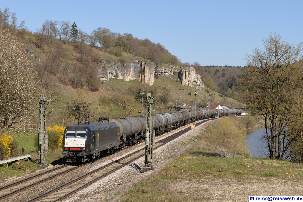 MRCE 145 086 führt einen Kesselwagenzug durch das Altmühltal bei Solnhofen. Am Anfang ihrer Karriere sah die Lokomotive