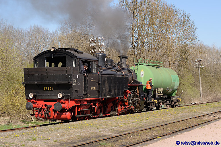97 501 rangiert in Blumberg, bevor sie mit ihrem Wasserwagen nach Fützen weiterfährt (23.04.2015).