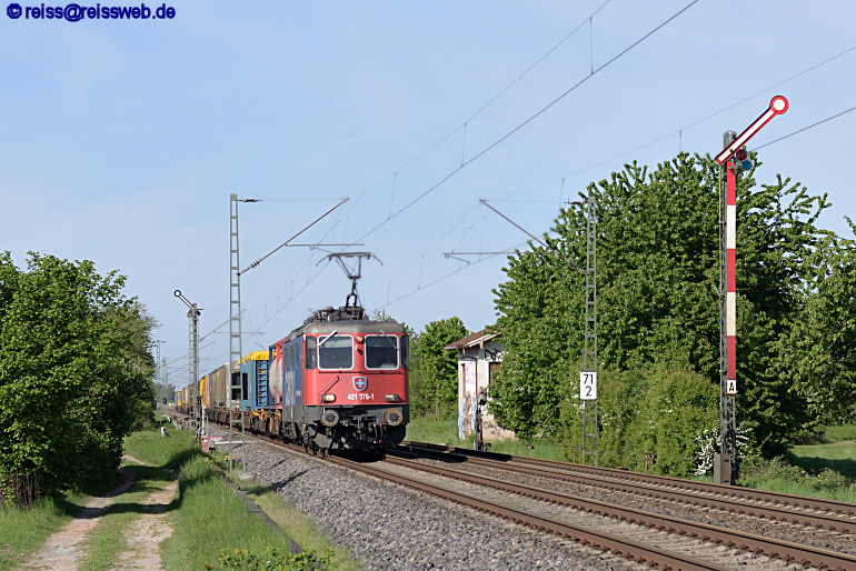 421 378 von SBB Cargo passiert die Blockstelle Bashaide in nördlicher Richtung. Deren Formsignale zeigen "immergrün", da sie nicht mehr besetzt ist (08.05.2015).