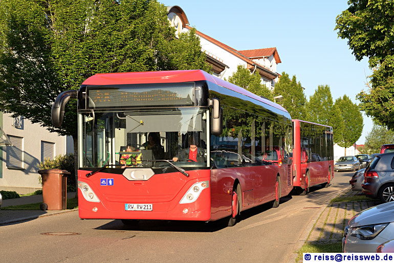 Göppel go4city12 mit Anhänger vom Stadtbus Rottweil fährt im Schülerverkehr durch die Überlinger Str. Richtung Zentrum (Rottweil, 22.05.2015).