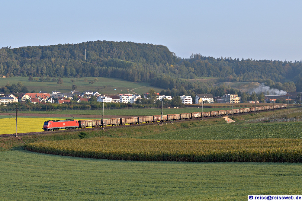 185 114 - von DB Schenker an SBB Cargo vermietet - hat in Schaffhausen einen Bio-Rübenzug aus Deutschland übernommen und bringt ihn zunächst in den RB Limmattal (Rafz, 26.09.2015).
