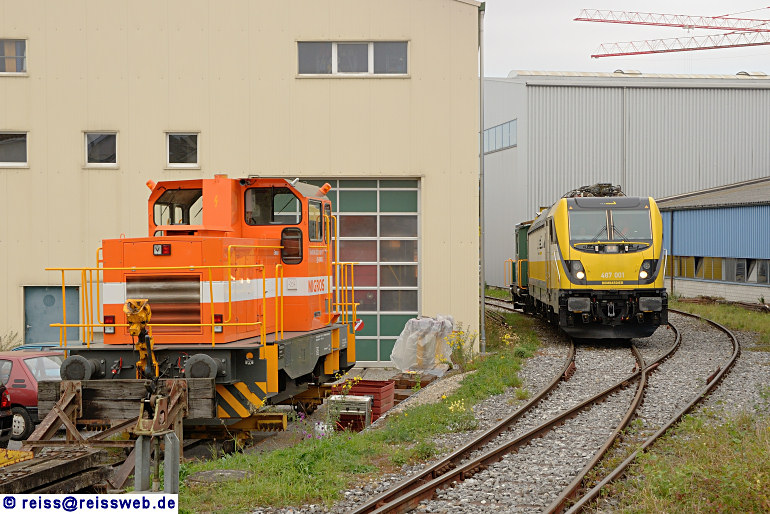 487 001 von SRT überführt Tm III 231 025 "Reinhard" von Stauffer Frauenfeld nach Effretikon, wo er im Bauzugdienst eingesetzt werden wird. Links Tm 2/2 237 969 von Migros Ostschweiz, der sich bei Stauffer zur Reparatur befindet (01.10.2015).