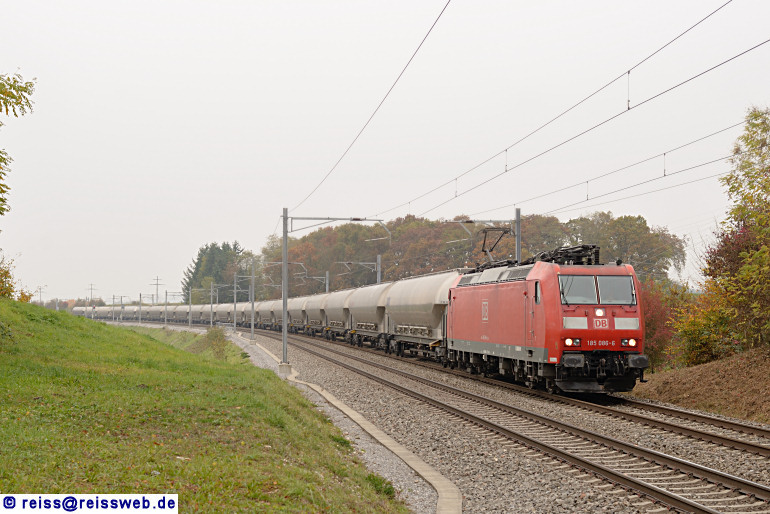 185 086 bringt leere Braunkohlenstaubwagen aus Zizers nach Schaffhausen. Die Wagen gehen nach Frechen bei Köln, wo sie beladen werden. Der Braunkohlenstaub wird im Zementwerk Untervaz zur Wärmeerzeugung benötigt (Fischerhölzli, 17.10.2015)